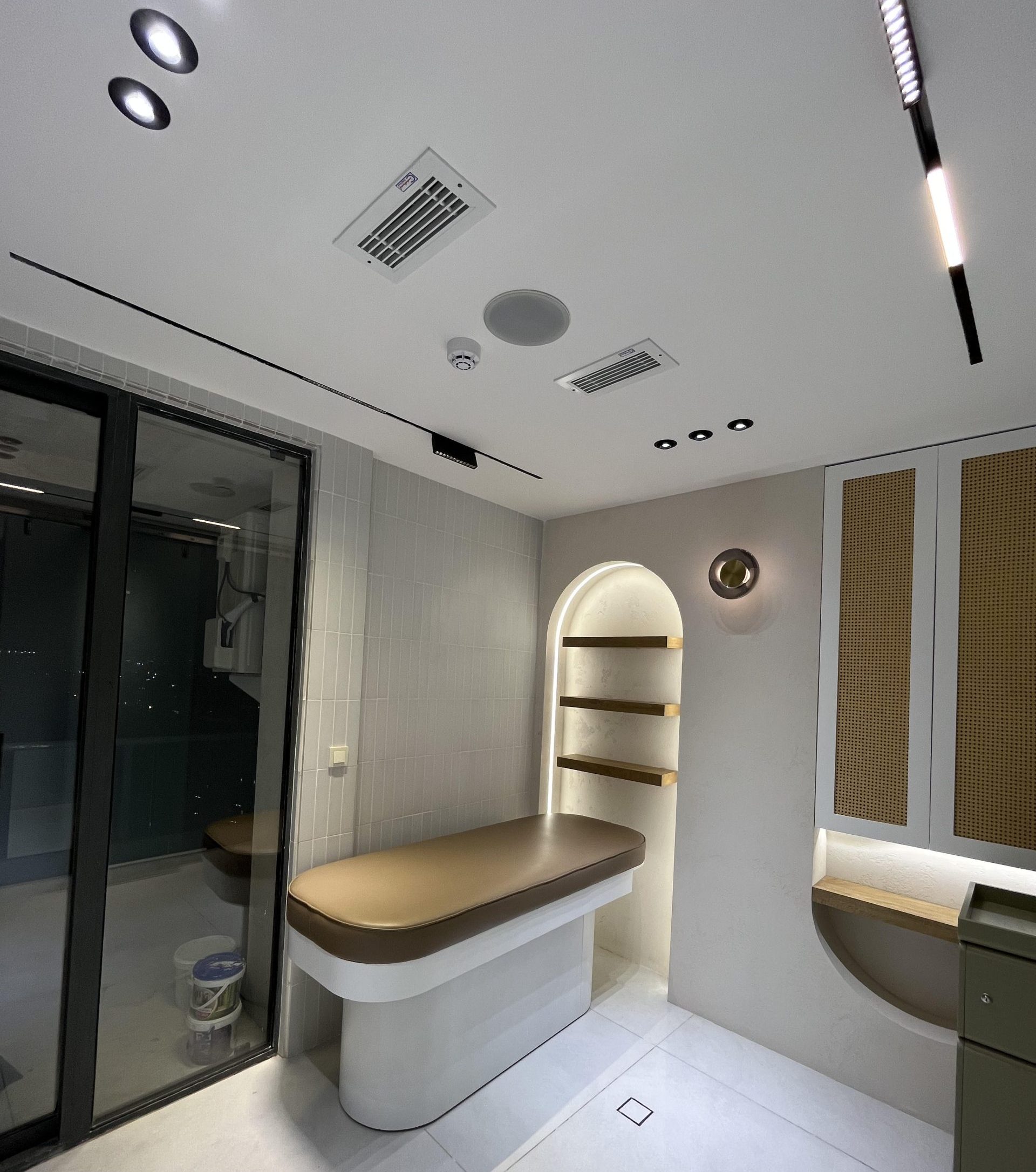 این فضاها نیاز به انعطاف‌پذیری نوری بالایی دارند؛ گاهی نور باید کاملاً روشن و سفید برای تشخیص دقیق مشکلات پوستی باشد و گاهی بسیار گرم و کم‌نور برای القای آرامش.